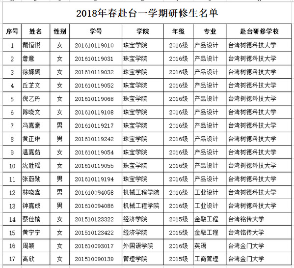 学校2018年春赴台湾高校一学期研修交流名单已定,来自管理学院、经济学院、机械工程学院、外国语学院、珠宝学院的18名学生将于3月中下旬赴台湾合作高校研修,并将于2019年1月中旬返校。现将学生名单公布如下(见附件)。