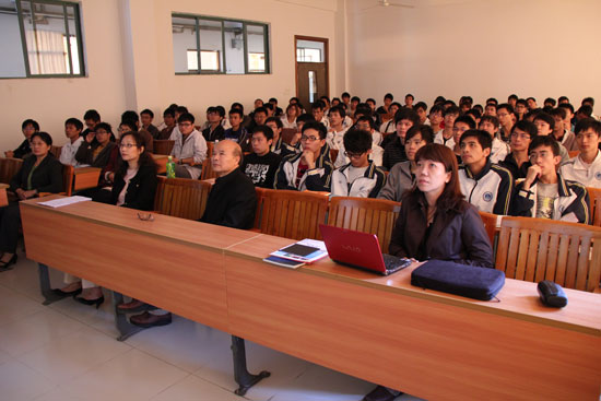 另一方,在A4-210课室举办的讲座氛围也十分浓郁,崑山科技大学代表团主讲人扬志芳博士结合短片介绍了崑山科技大学及研修项目乃至台湾的风土人情。她说道:“刚刚我们参观了贵院,贵院的学生能在这么好的环境、设备的大学中学习真是太幸福了。同样,台湾风景优美,我们学校的环境和设备也不差,欢迎大家能去参观崑大。”
