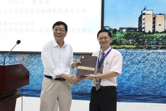 讲座开始前,黄培伦院长对陈宗豪主任一行来访表示热烈欢迎,阐释大陆与台湾两岸高校交流的目的和意义:鼓励学生多参与此类学术讲座,加强两岸文化和学术的交流。并代表管理学院向陈宗豪主任赠送纪念品。