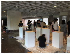 图四:学生自发翻新展柜 图五:爱现工艺大展开幕式 图六:我校师生爱现工艺大展作品展区