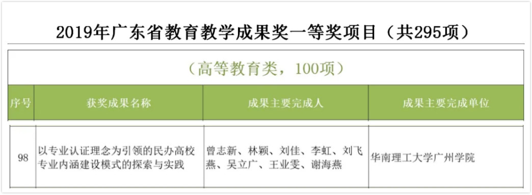 本网讯(记者 谢海燕)3月12日,广东省教育厅公布了2019年广东省教育教学成果奖获奖项目,我校常务副校长曾志新教授申报的成果《以专业认证理念为引领的民办高校专业内涵建设模式的探索与实践》荣获高等教育广东省教育教学成果奖一等奖。这是我校连续第三次荣获广东省教学成果奖,也是首次荣获一等奖。