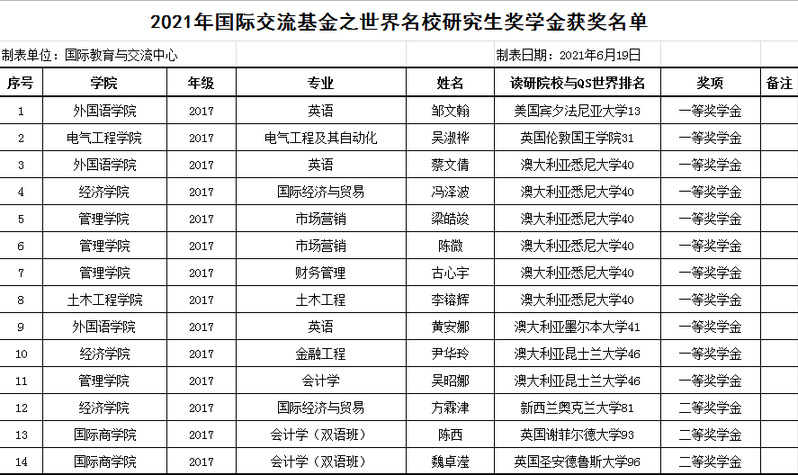为鼓励优秀学生报考世界名校研究生、支持大四学生赴世界名校深造、树立优秀学生典型、提高学校人才培养质量,2021年5月,我校组织开展了“国际交流基金之世界名校研究生奖学金”评选工作,并就评选结果进行了公示。
