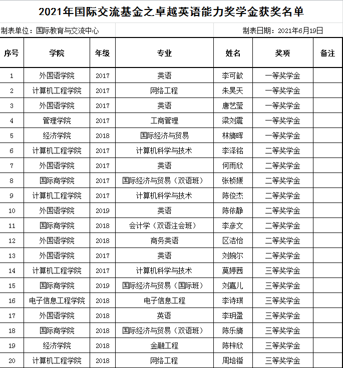 为鼓励在校学生提高外语水平、进一步扎实推进学校国际项目、提高学校国际化人才培养质量,2021年5月,我校组织开展了“国际交流基金之卓越英语能力奖学金”评选工作,并就评选结果进行了公示。