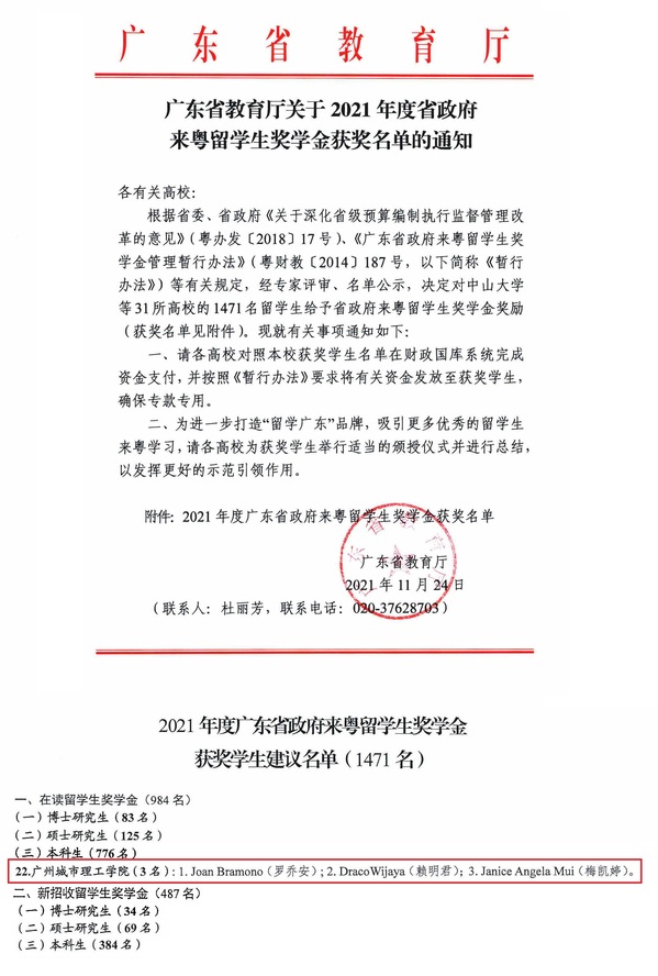 本网讯(记者 黄卉菁 钟宇琛 张佳佳)12月5日,我校收到广东省教育厅《关于2021年度省政府来粤留学生奖学金获奖名单的通知》,国际商学院3名印度尼西亚籍学生Joan Bramono、Draco Wijaya、Janice Angela Mui获2021年度广东省政府来粤留学生奖学金。