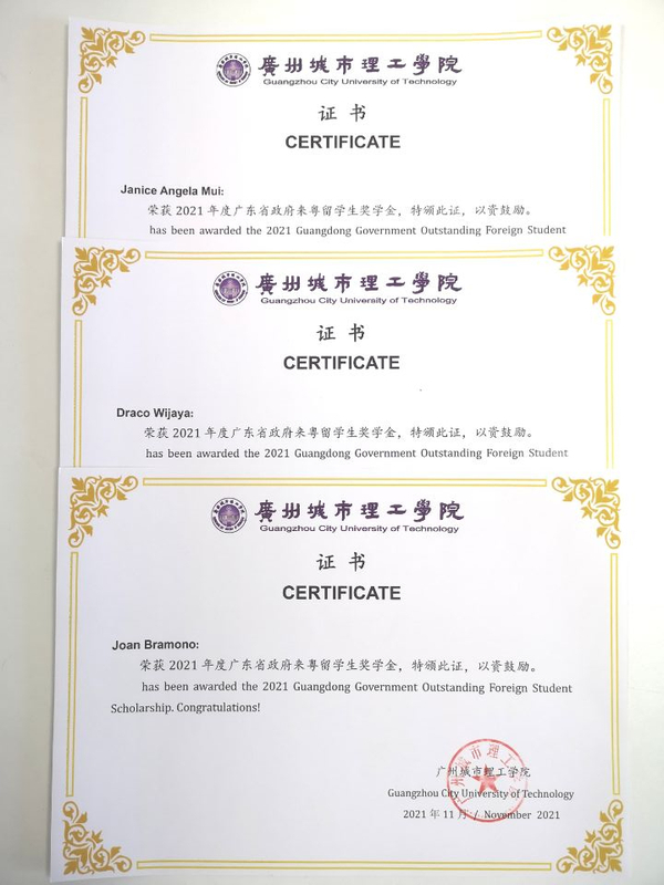 2021年我校获得3个在读本科生奖学金名额,经学生个人申请、校内综合测评与推荐、广东省教育厅与广东省财政厅复核等程序,3名学生成功获奖,这也是我校连续第6年有国际学生获得此奖学金。收到获奖消息后,远在印尼雅加达的2019级国际经济与贸易专业Draco Wijaya同学激动地表示:“得知我获得2021年广东省政府来粤留学生奖学金后非常高兴,这是对我学习成果的肯定!虽然目前因疫情我们无法回到学校学习,但是认真学习、完成课程任务、提升自己的学术水平仍是我不断努力的目标。”