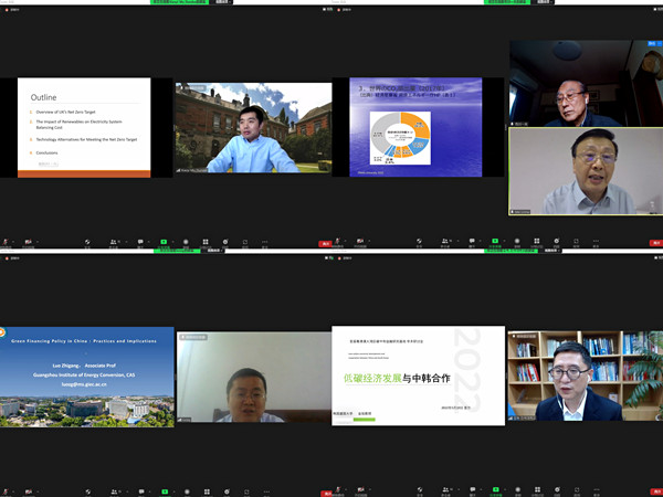 研讨会上,金旭教授以“韩国低碳经济发展与中韩合作”为主题进行演讲。他从中韩两国气候目标着手,梳理了韩国和中国低碳经济政策的发展脉络,并逐渐切入低碳经济的核心——能源转型,完整介绍了文在寅政府的新能源政策以及尹锡悦政府对韩国气候目标的继承和对新能源政策的改革方向。随后,通过韩中新万金合作项目,概述了中韩在未来共同推动低碳经济发展的协作路径。