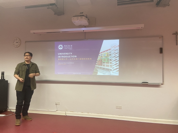 10月12日,交流团参观了我校在澳门的合作大学——澳门圣若瑟大学。在该校的青州校区,招生事务主任朱钧豪从办学历史、学校特色、学术成果、国际交流、学生生活等五个方面向学生详细介绍了圣若瑟大学,并讲解了我校与圣若瑟大学合作开展的保荐研究生项目的报名条件、专业课程、就业前景等信息。