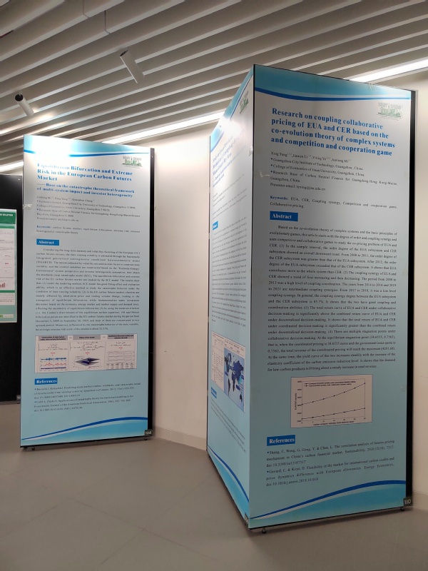 经济学院提供“Equilibrium Bifurcation and Extreme Risk in the European Carbon Futures Market——Base on the catastrophe theoretical framework of multi-system impact and investor heterogeneity”“Research on coupling collaborative pricing of EUA and CER based on the co-evolution theory of complex systems and competition and cooperation game”“Study on Green Development Mechanism of Guangdong-Hong Kong-Macao Greater Bay Area —— Based on comparison with the other three major bay areas in the world”等3篇学术论文被安排在会议现场进行展示。