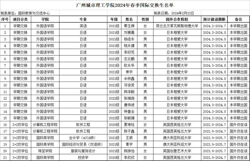 2023—2024学年度第二学期,学校共有15名来自外国语学院的学生分别赴荷兰、日本的合作院校参加学期交换项目,另有计算机工程学院、珠宝学院、国际商学院6名学生仍分别在澳大利亚、英国的合作院校参加2+2/3+1双学位项目,现公布学生名单(见附件)。