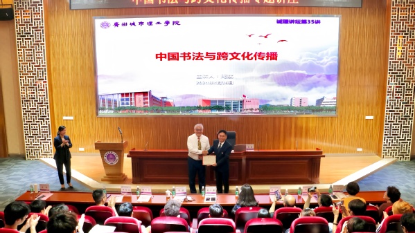 本网讯(记者 陈丽君)4月16日晚,我校在行政楼703会议室举行诚理讲坛第35讲,特邀上海交通大学人文学院二级教授、书法跨文化心理学研究方向博士生导师、中国书法文化国际传播研究所所长周斌教授以“中国书法与跨文化传播”为题主讲。学校副校长刘洊波、国际商学院院长兼国际教育与交流中心主任安然、校团委、人事处、国际教育与交流中心相关部门负责人、各学院及盎然阁书法协会师生代表共160余人参加讲座。