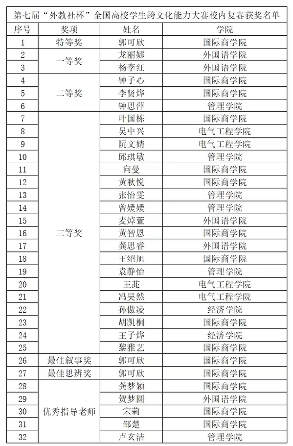 第七届“外教社杯”全国高校学生跨文化能力大赛校内复赛获奖名单