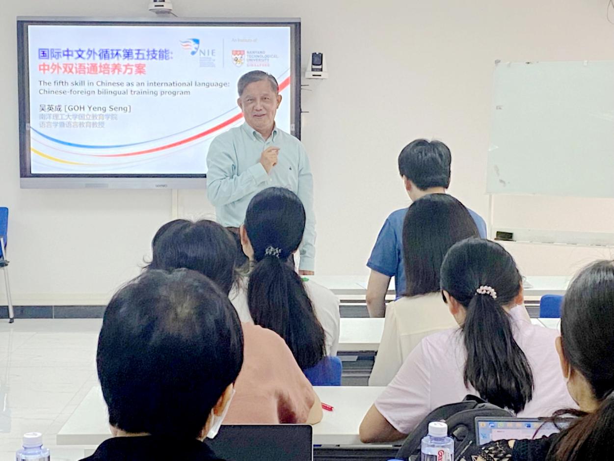 6月17日下午,吴英成还面向国际商学院、外国语学院的教师开设了一场主题为“国际中文外循环第五技能: 中外双语通培养方案”的讲座。吴英成在分析中国“以国内大循环为主体、国内国际双循环相互促进”的新发展格局基础上,提出以“中文内外双循环为依托”的国际中文教育可持续发展新战略。他指出,我们要了解语言的内循环和外循环功能,要懂得自己眼里的自己和他人眼里的自己是不一样的,要学会从外部视角看中国,也就是要理解语言的外循环功能。他还跟老师们探讨了语言经济学在国际贸易、跨文化交流、语言教育等领域的应用,指出当前国际中文外循环就业市场需要大量的英语好,专业精的复合型人才,我们应顺势而为,做好中外双语通人才的培养。