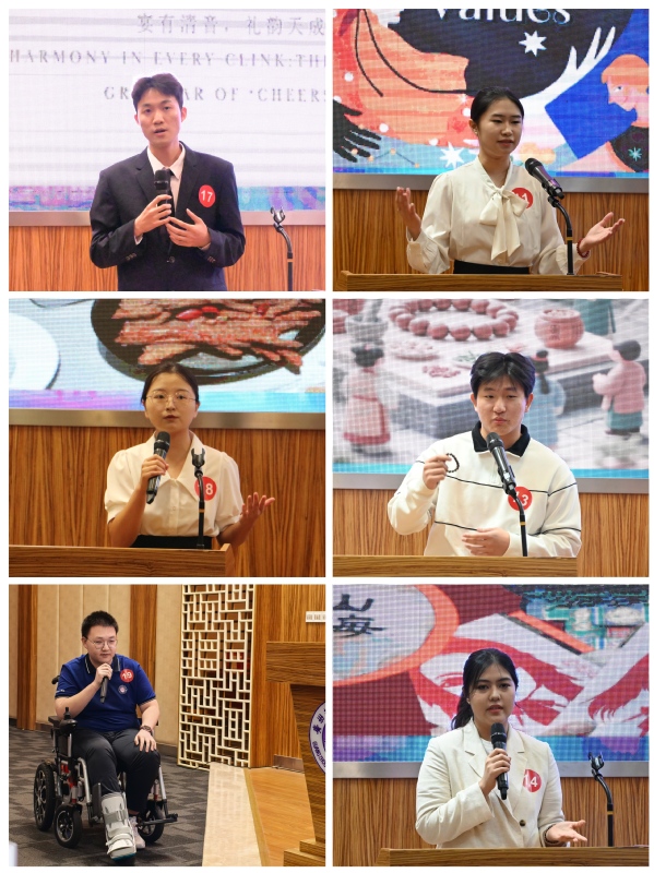 本次赛事以“坚定文化自信 增进国际理解”为主题,设置英语演讲、评委问答、跨文化相关名言名句解析三个环节。在英语演讲环节,选手们以“讲述中国故事”为主题,分别围绕中国传统价值观、中国古代文化、改革开放中的当代中国、家乡文化、药食、中医、生肖、节气、地域美食等话题,阐述了自己对中外文化异同、中国文化走向世界等方面的见解;名言名句解析环节则考验选手的跨文化意识和思辨能力,选手需要在短时间内结合名言的内容分析如何看待文化多样性、促进文化交流融合、加强跨文化教育等知识点。在紧凑的比赛环节中,选手们全程使用英语分享自己的观点,展现了当代大学生对中国文化的热爱和自信以及对世界多样文化尊重、开放、包容的态度,选手表现出色,比赛现场掌声频频响起。一位腿部受伤的学生行动不便,仍坚持坐着轮椅完成整场比赛。他永不言弃的精神赢得了全场观众的热烈掌声,生动诠释了跨文化能力大赛的魅力。