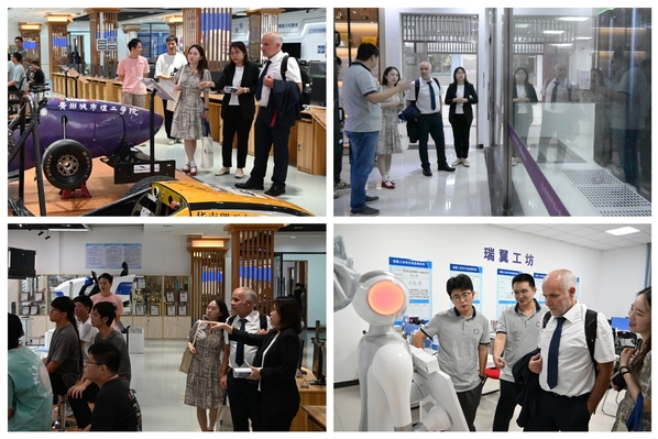 此外,利物浦大学代表团还参观了计算机实验中心与绿智交通产业学院汽车展厅。在计算机实验中心,来宾亲身体验了中医体质检测机器人;在汽车展厅,来宾参观了智能驾驶实训平台、汽车虚拟仿真教学区等实践教学场景,对我校在实验室建设、产教融合与应用型人才培养方面取得的成果给予高度评价。