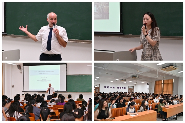 此后,Martin Gairing教授面向相关学院的学生主讲题为“从交通拥堵到智慧城市——博弈论的实践应用”的国际学术讲座。他结合自身国际化的学术研究经历,列举新加坡、韩国、德国、英国等多个国家的交通网络设计案例,向学生生动讲解了优化交通网络的最优解不在不断建设道路,而在有效进行交通分流、引入智能监控系统,同时要寻求交通网络与城市绿地的平衡,实现可持续城市发展。张砚涵则详细介绍了利物浦大学的悠久历史与办学优势。现场学生反应热烈,表现出浓厚的兴趣与强烈的出国留学意愿。