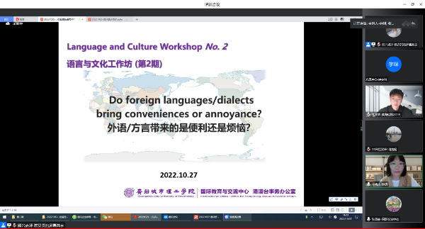 本网讯(记者 钟宇琛)秋高气爽夜,城理云端见。10月27日晚,由我校国际教育与交流中心主办的 “语言与文化双语互动工作坊”在线上举行,吸引了来自14个二级学院的167学生参加。工作坊现场(国际教育与交流中心 提供...