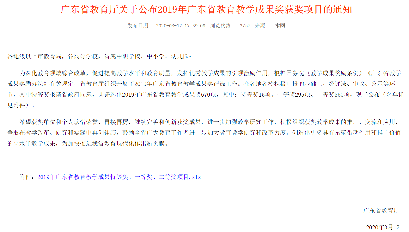 本网讯(记者 谢海燕)3月12日,广东省教育厅公布了2019年广东省教育教学成果奖获奖项目,我校常务副校长曾志新教授申报的成果《以专业认证理念为引领的民办高校专业内涵建设模式的探索与实践》荣获高等教育广东省教...