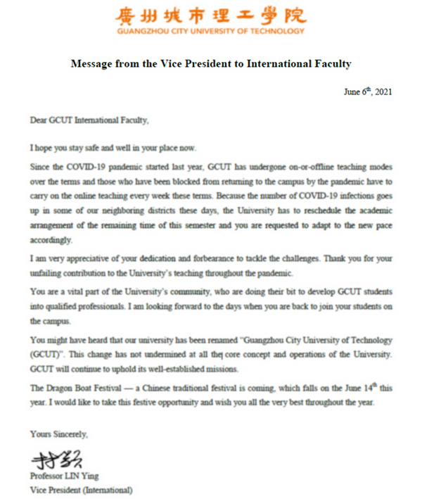 本网讯(记者 钟宇琛 张佳佳)当前广州疫情防控形势较为复杂,为全面落实疫情防控工作,保障师生员工的健康安全,确保教学有序进行,6月6日-10日,我校组织开展了境内外的外教及在穗留学生抗“疫”慰问关怀活动。副...