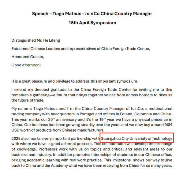 本网讯(记者 黄凤娟)4月18日,在第137届中国进出口商品交易会(广交会)如火如荼举办之际,国际商学院收到来自合作企业——葡萄牙跨国企业JOINCO公司中国区负责人Mr.Tiago Mateus的邮件,其中传递的消息令人振奋:4月1...