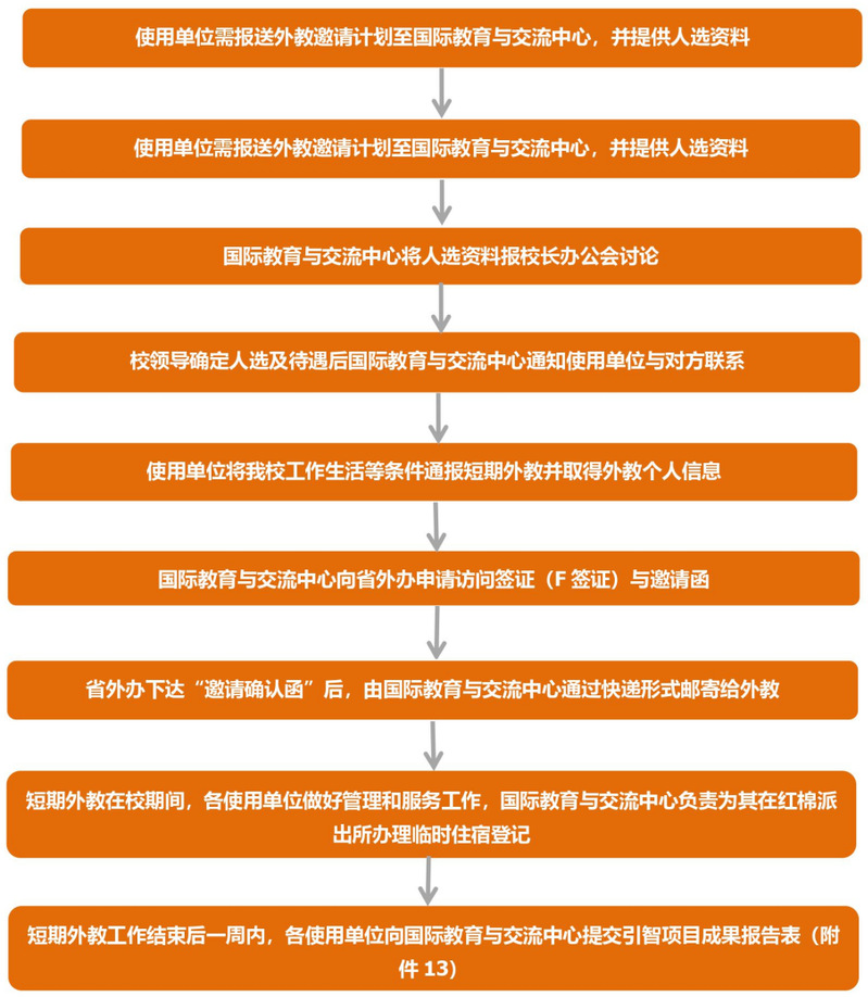 :本程序适用于以我校名义聘请短期外教,外教在境外申请签证时中国驻外使领馆要求其出示 “邀请确认函”的情况。