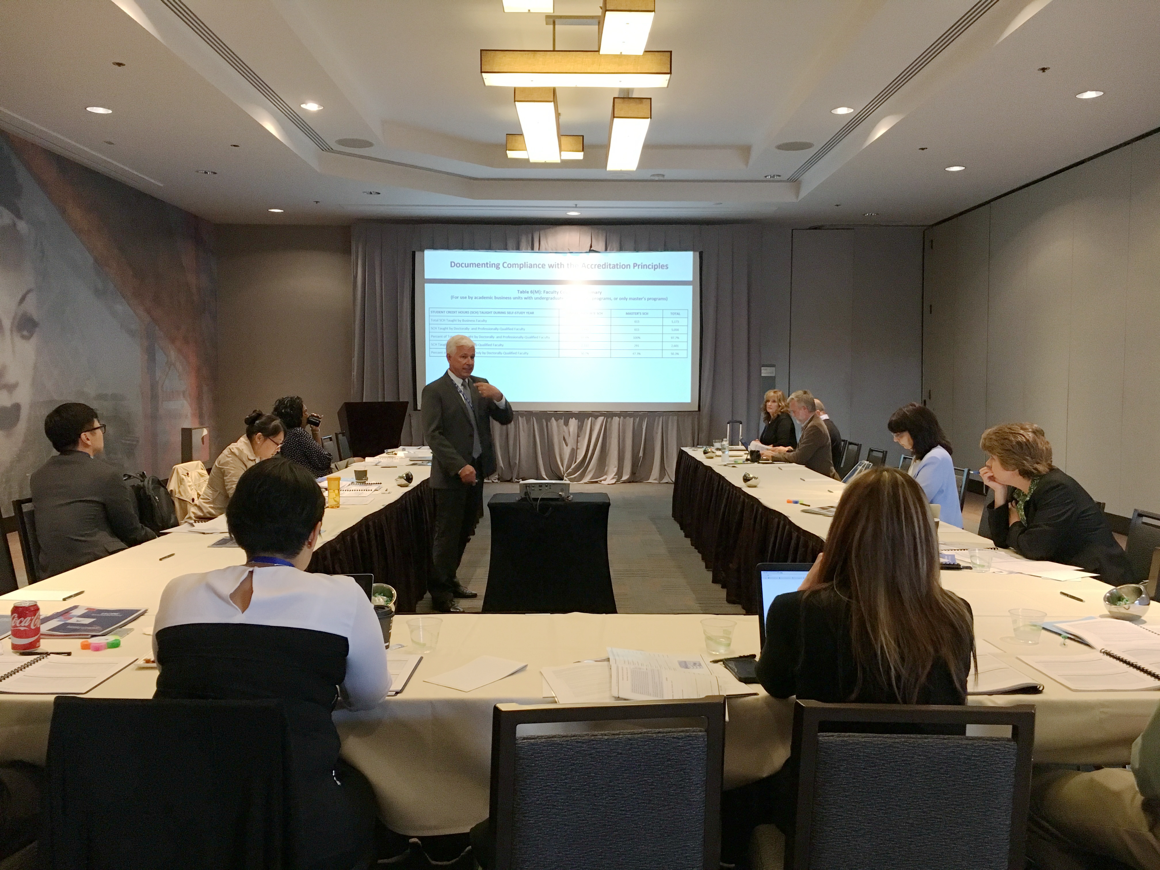 工作坊由IACBE欧洲办事处及全球发展主任Paul Mallette先生主讲,他说道,成果评估体系(outcomes assessment)是IACBE认证的重要基础和框架,正式会员资格申请阶段主要进行自评(self-study),即成员院校在一个学年度执行成果评估计划,然后根据得出的数据和结论撰写《自评书》,提交给IACBE以申请正式会员资格。待IACBE审阅申请材料并进行正式会员现场考察和评估后,其认证委员会将决定成员院校能否获得正式会员资格。