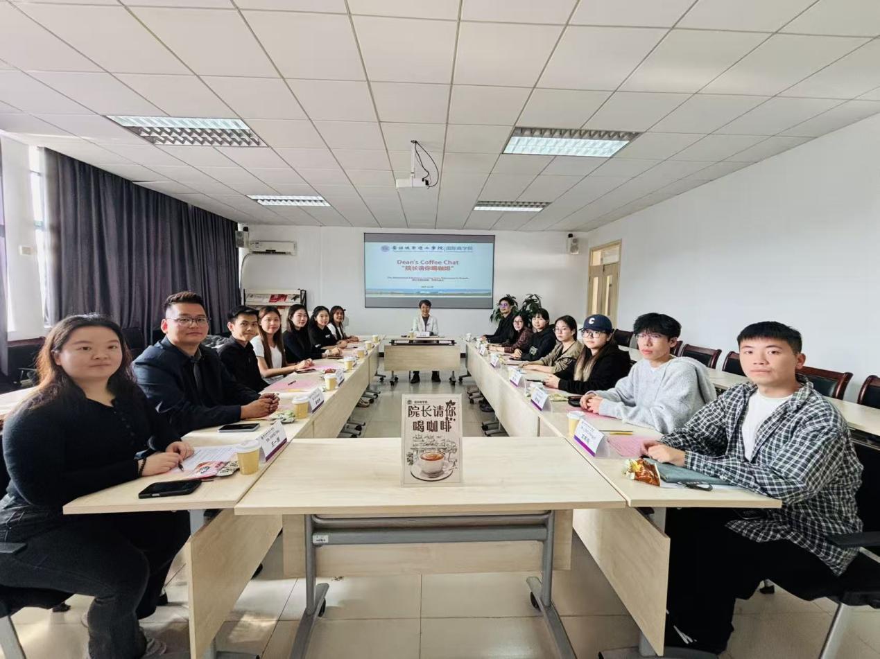 本网讯(记者 龙鹏骏 王一旭)12月4日下午,国际商学院在A6-308举办本学期第4场“院长请你喝咖啡”主题交流活动。本次活动以“跨文化适应旅程:探索与成长”为主题,5名来自柬埔寨的国际学生与5名中国学生代表共聚一堂,在氤氲咖啡香中用英文分享跨文化适应体验,共话成长感悟。国际商学院院长安然教授不仅亲自策划并全程参与,更以她独特的亲和力和专业视角,将活动升华为深度跨文化对话的典范。党总支副书记梁伟滔、国际学生的辅导员和班主任以及国际交流与合作处相关老师参加了活动。活动由安然教授主持。